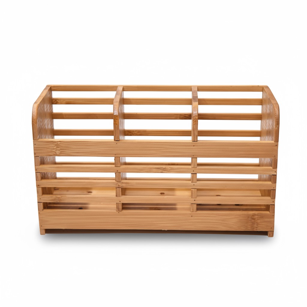 برای کسانی که عاشق نظم در عین سادگی هستن، این ارگانایزر چوبی سه‌خانه‌ای، انتخابی بسیار کارآمد و خوش‌ساخته‌ست. طراحی افقی و باز این مدل، دسترسی سریع به قاشق، چنگال یا حتی لوازم نوشتاری را فراهم می‌کند.