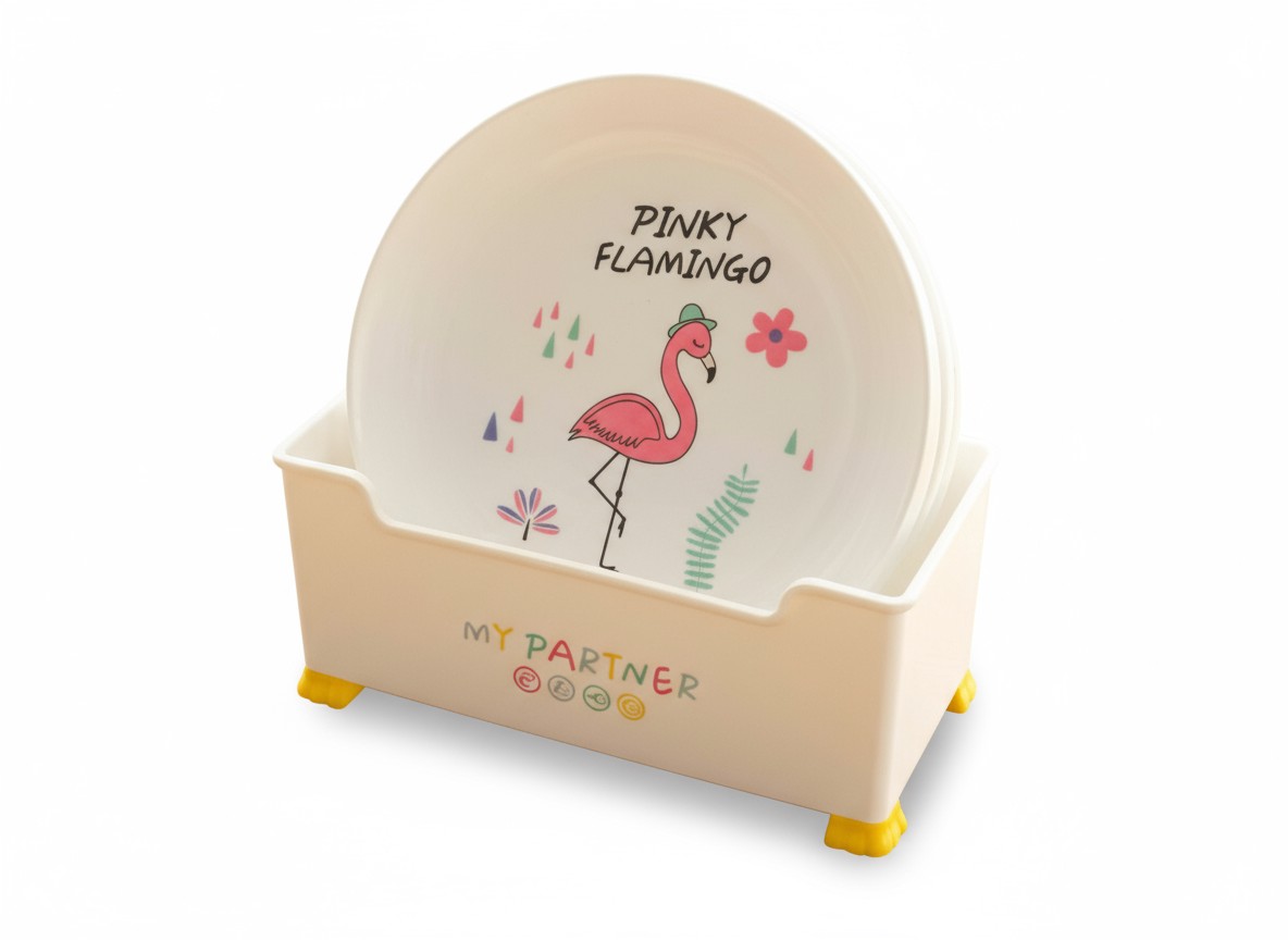 پایهی نگهدارنده، بشقابها را بهصورت عمودی و منظم کنار هم قرار میدهد؛ در نتیجه فضای کمتری روی میز یا داخل کابینت اشغال میشود و حملکردن ست برای پیکنیک یا مهمانی بسیار آسان است. رنگ سفید پایه در کنار طرحهای شاد روی بشقابها، ظاهری تمیز و کودکپسند ایجاد میکند.