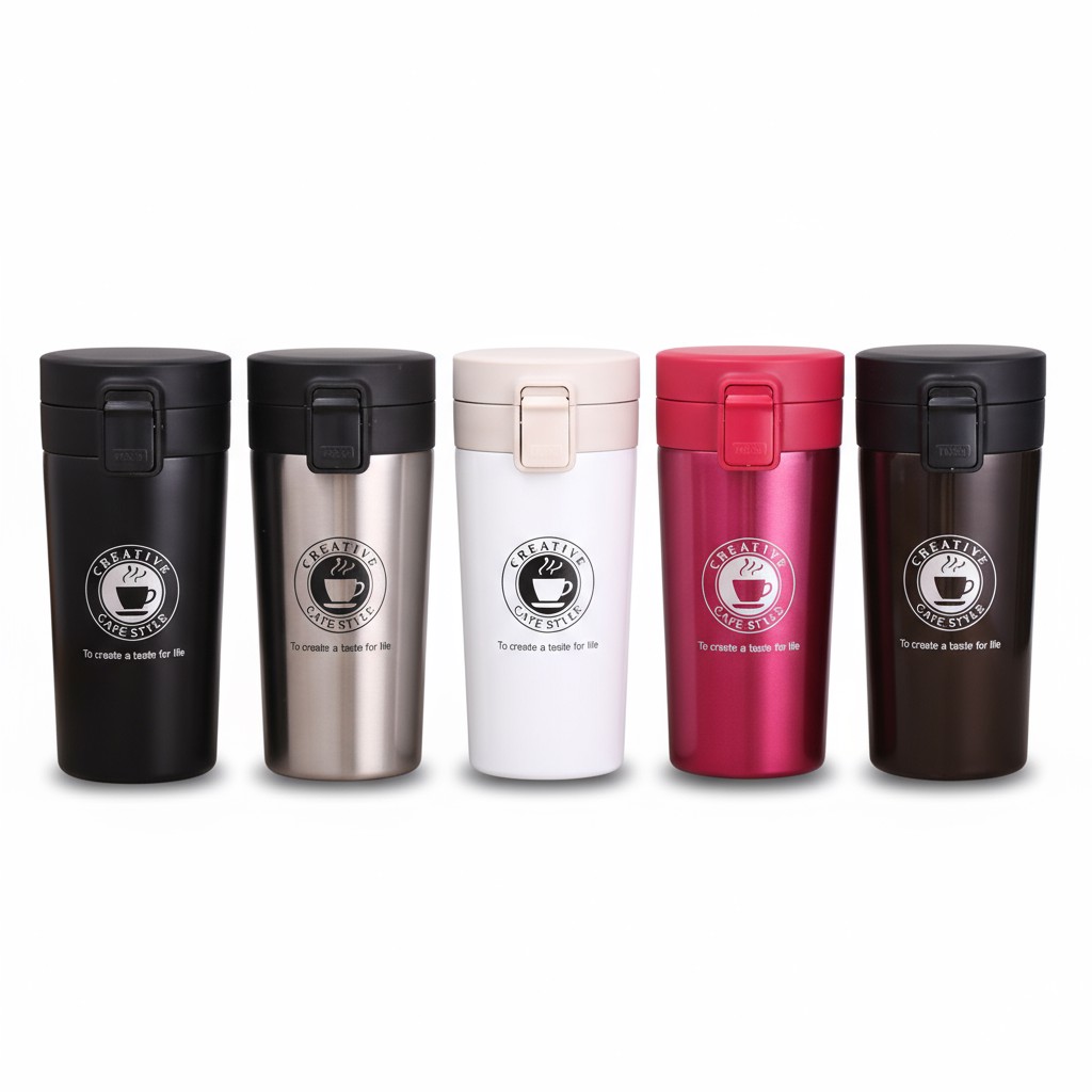 این تراول ماگ در پنج رنگ مدرن عرضه میشود تا هر سلیقهای را راضی کند: مشکی کلاسیک، نقرهای متالیک، سفید شیری، صورتی متالیک و قهوهای شکلاتی.