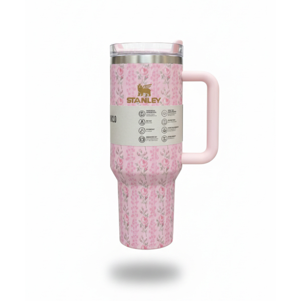 طرح صورتی گلدار این مدل جلوه‌ای بسیار لطیف و ظریف داشته و گزینه‌ای خاص برای بانوان و علاقه‌مندان به استایل‌های فانتزی و دخترانه است. اگر به دنبال تامبلری بزرگ، مقاوم، زیبا و کاربردی هستید، این تامبلر استنلی یکی از بهترین انتخاب‌ها برای شما خواهد بود.
